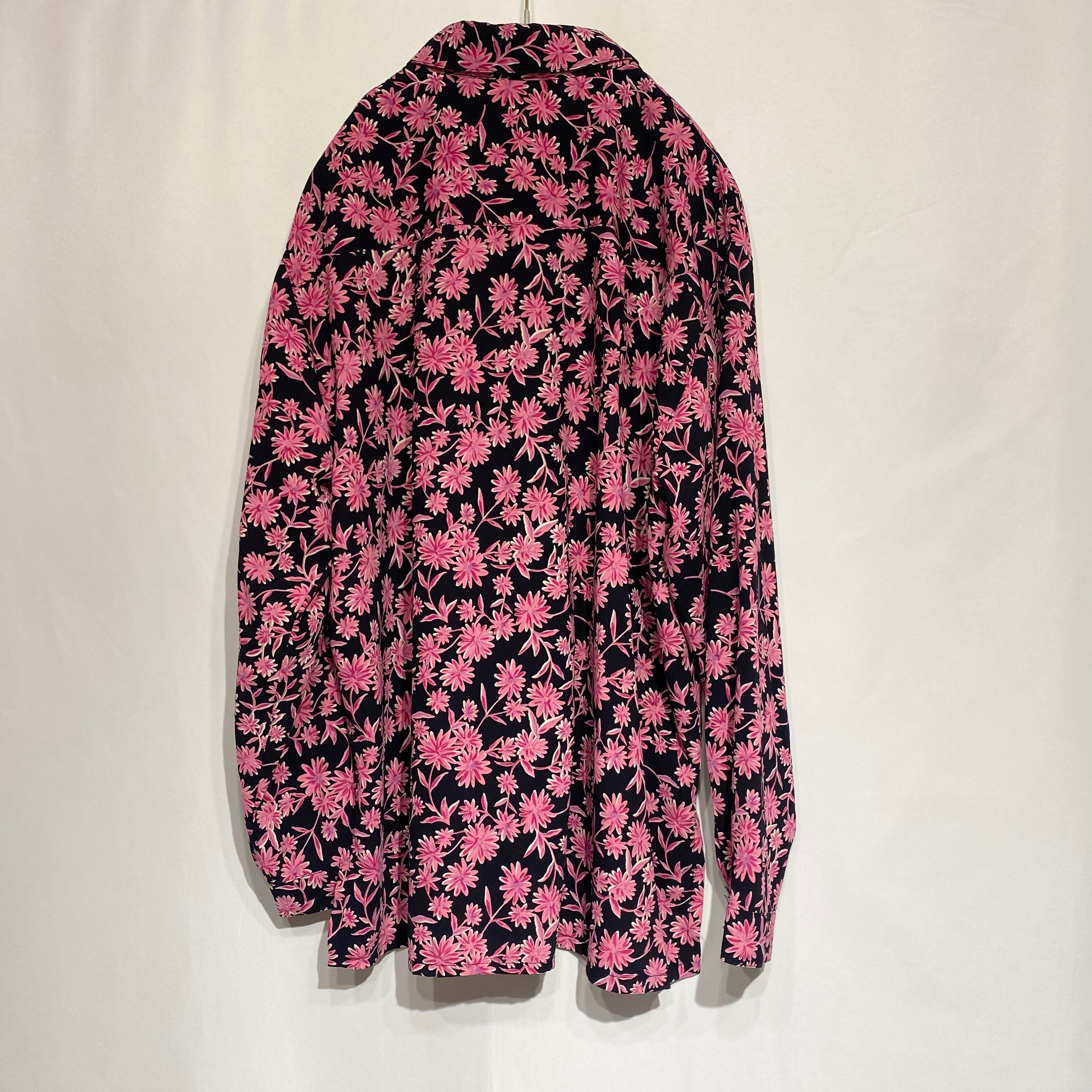 黒地にピンクの花柄がレトロな柄シャツ◎