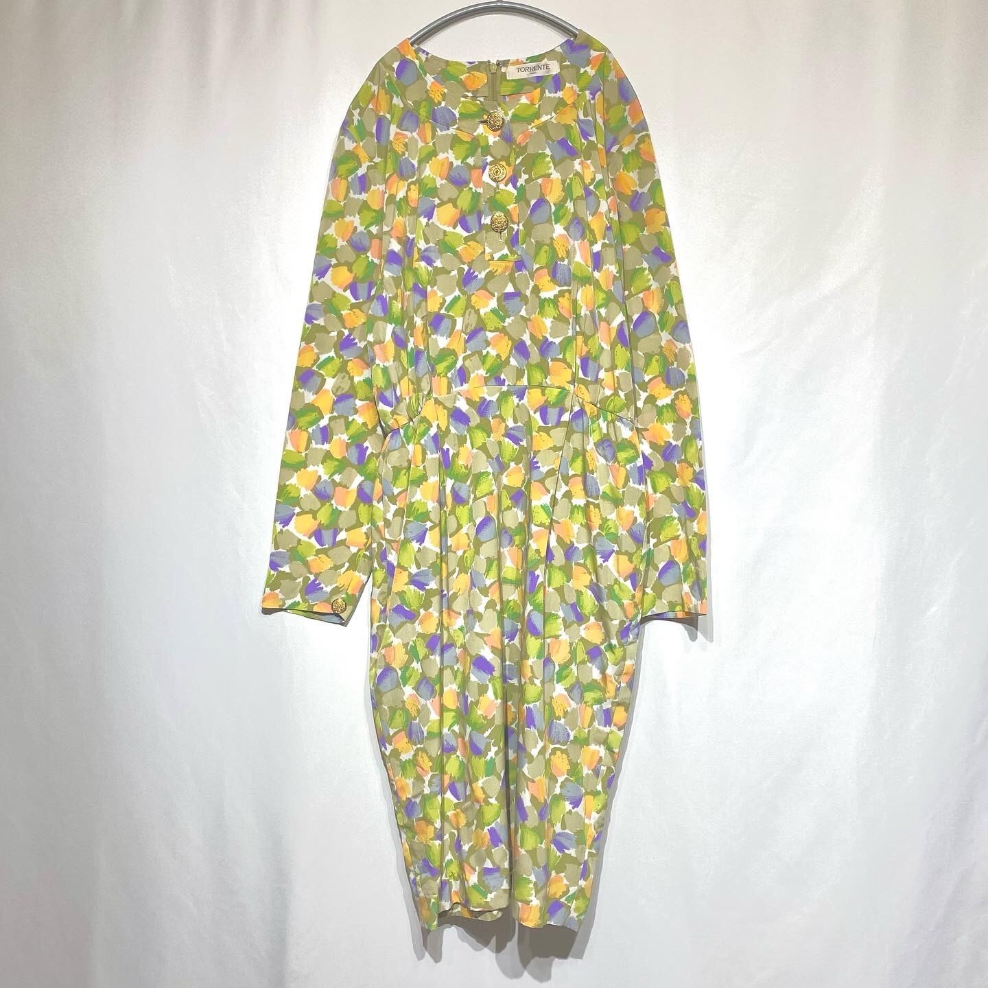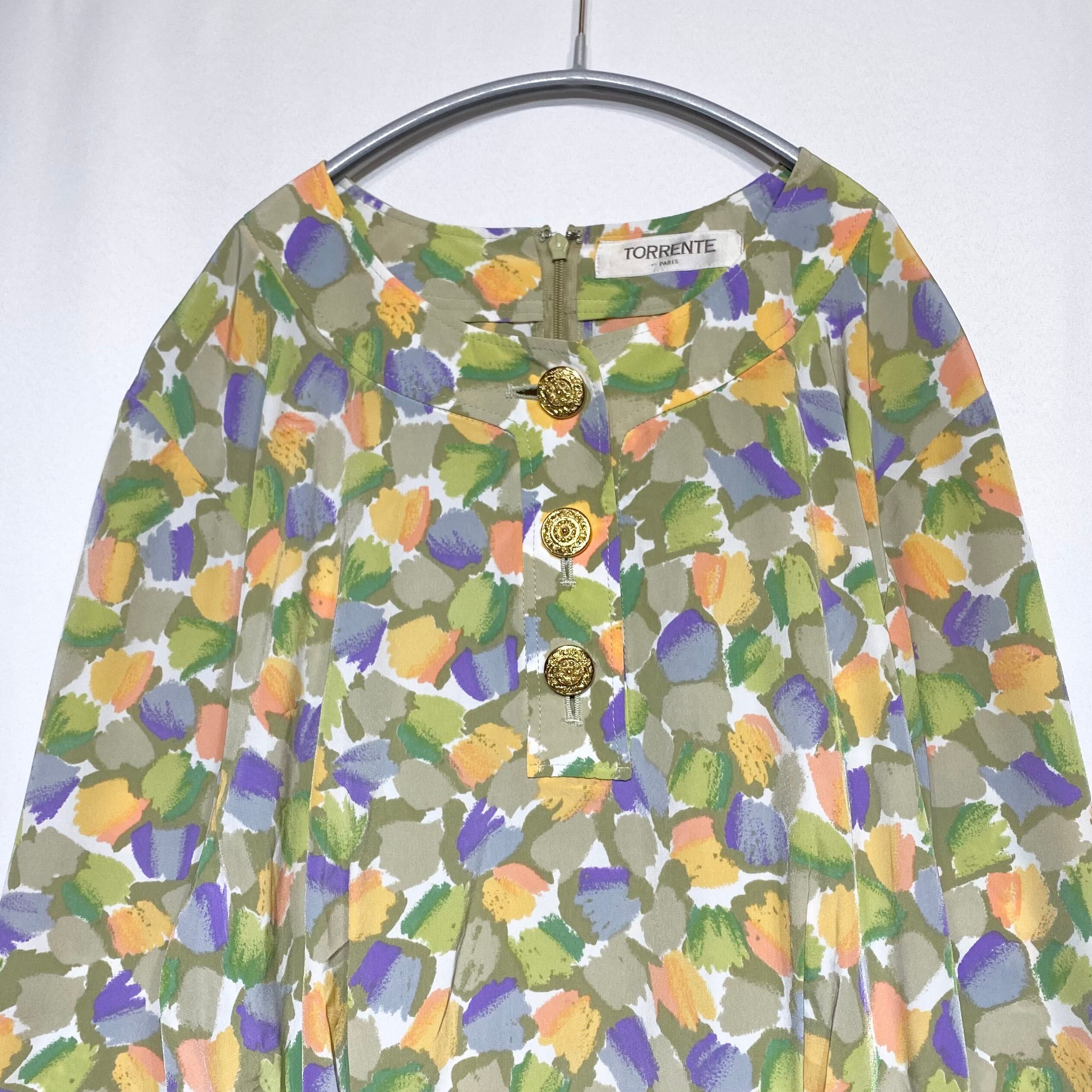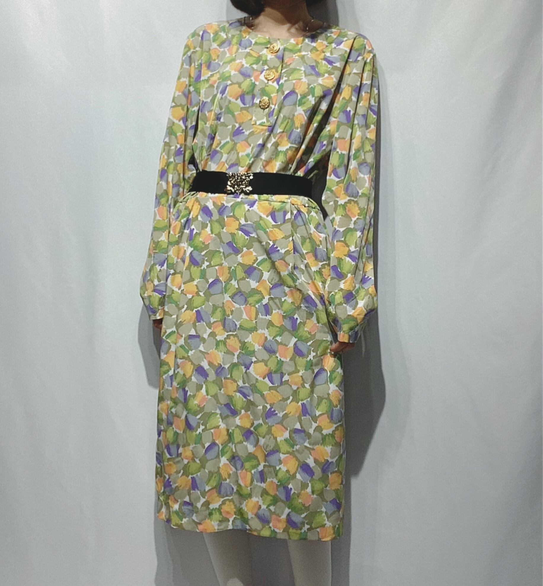 古着屋 レトロ 春色 総柄 金ボタン ワンピース