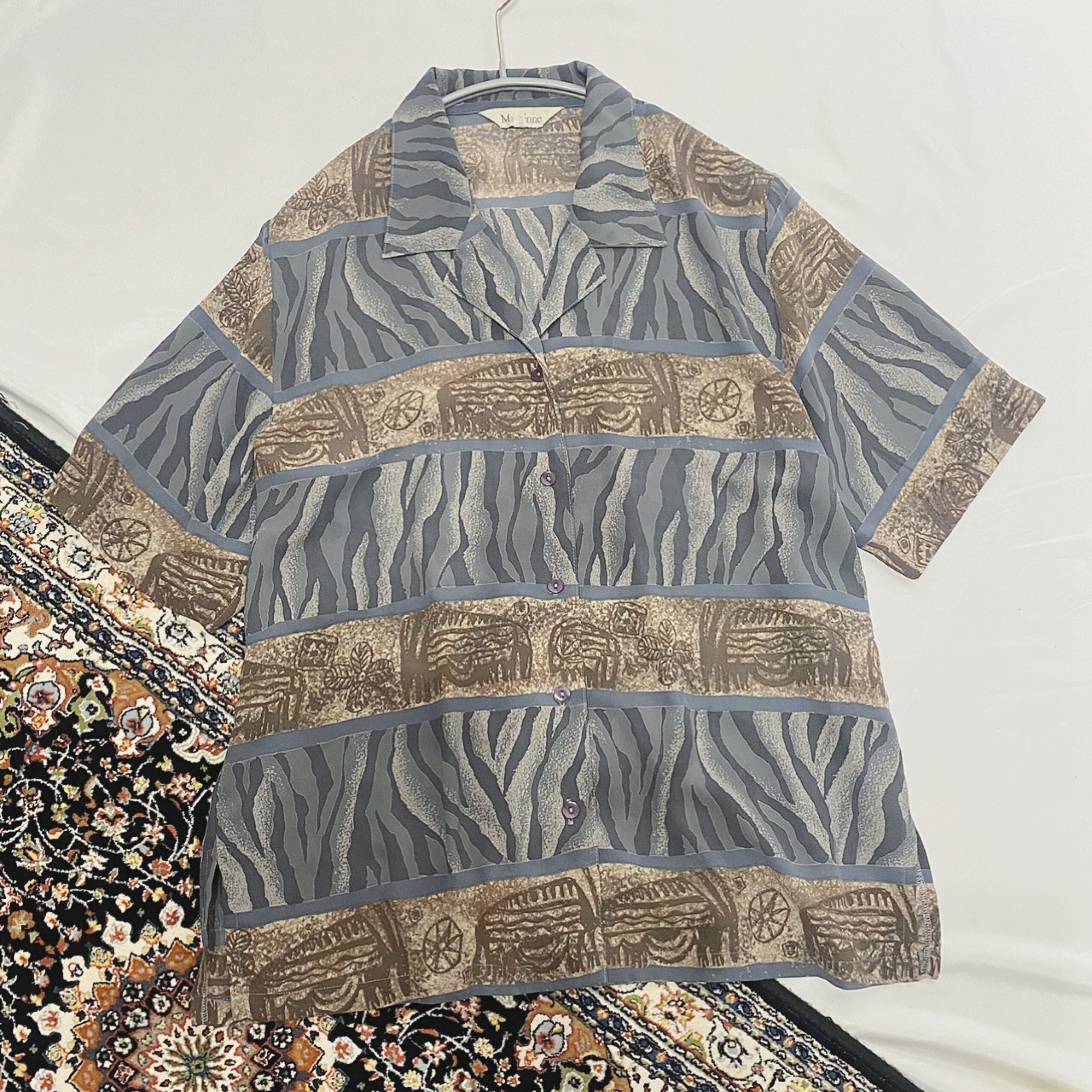 壁画のような柄とゼブラ柄が個性的な柄シャツ◎