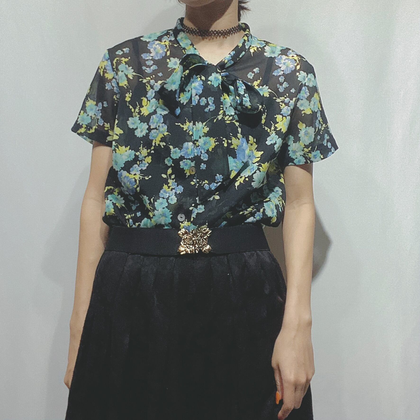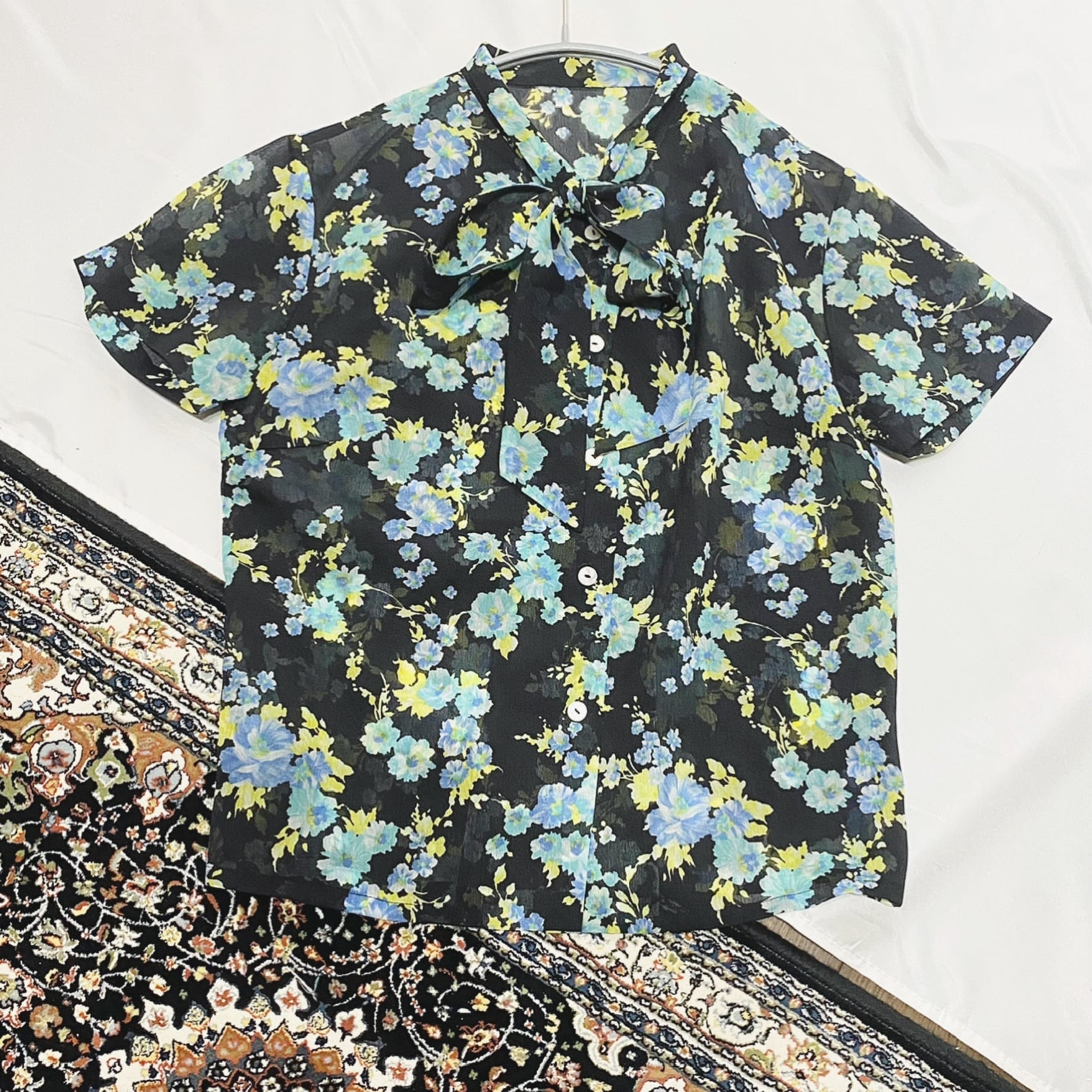 古着屋 レトロ 花柄 シアーシャツ リボン 棒タイ ブラウス