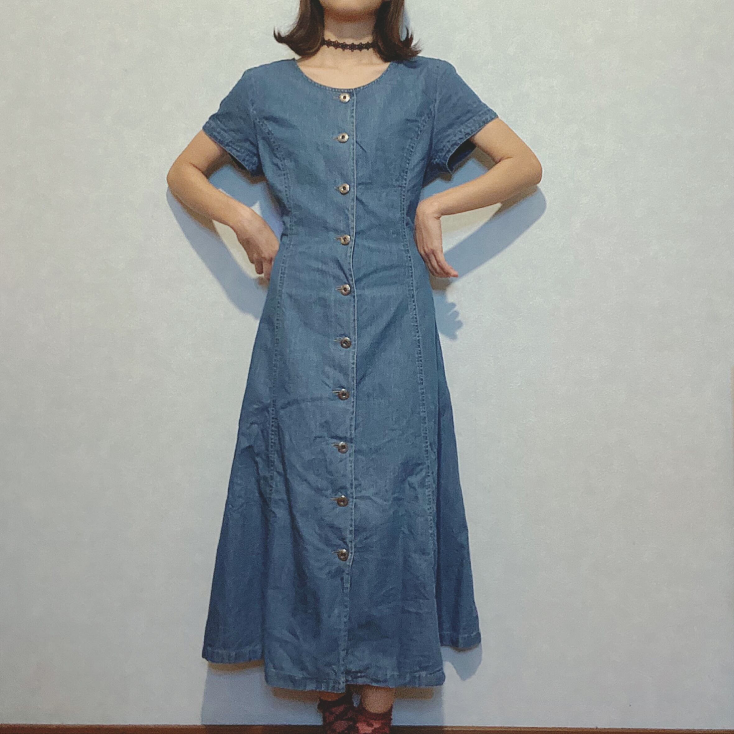 古着屋 レトロ マキシ丈 編みリボン デニムワンピース