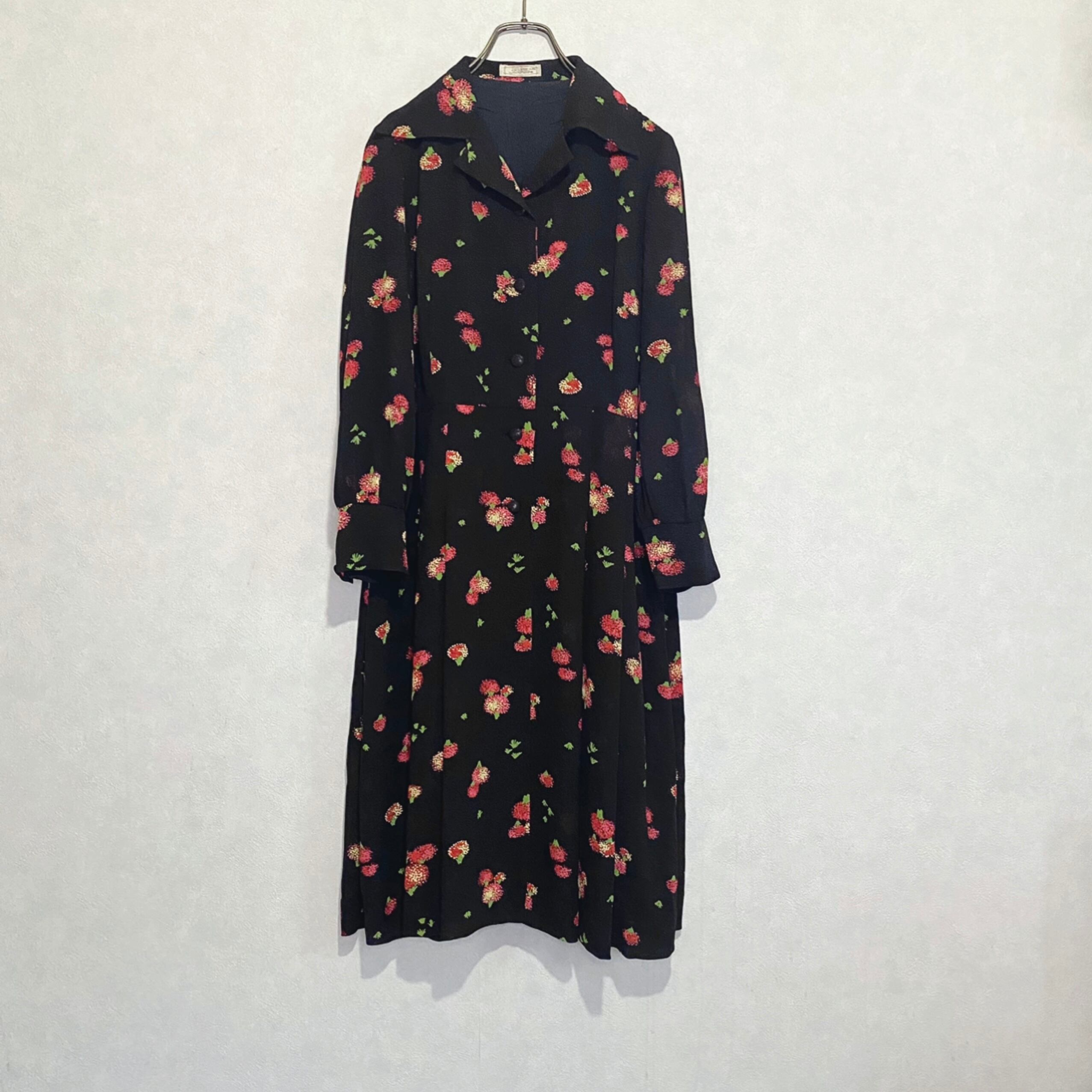 古着屋 昭和レトロ ブラック 花柄 総柄 開襟 ワンピース