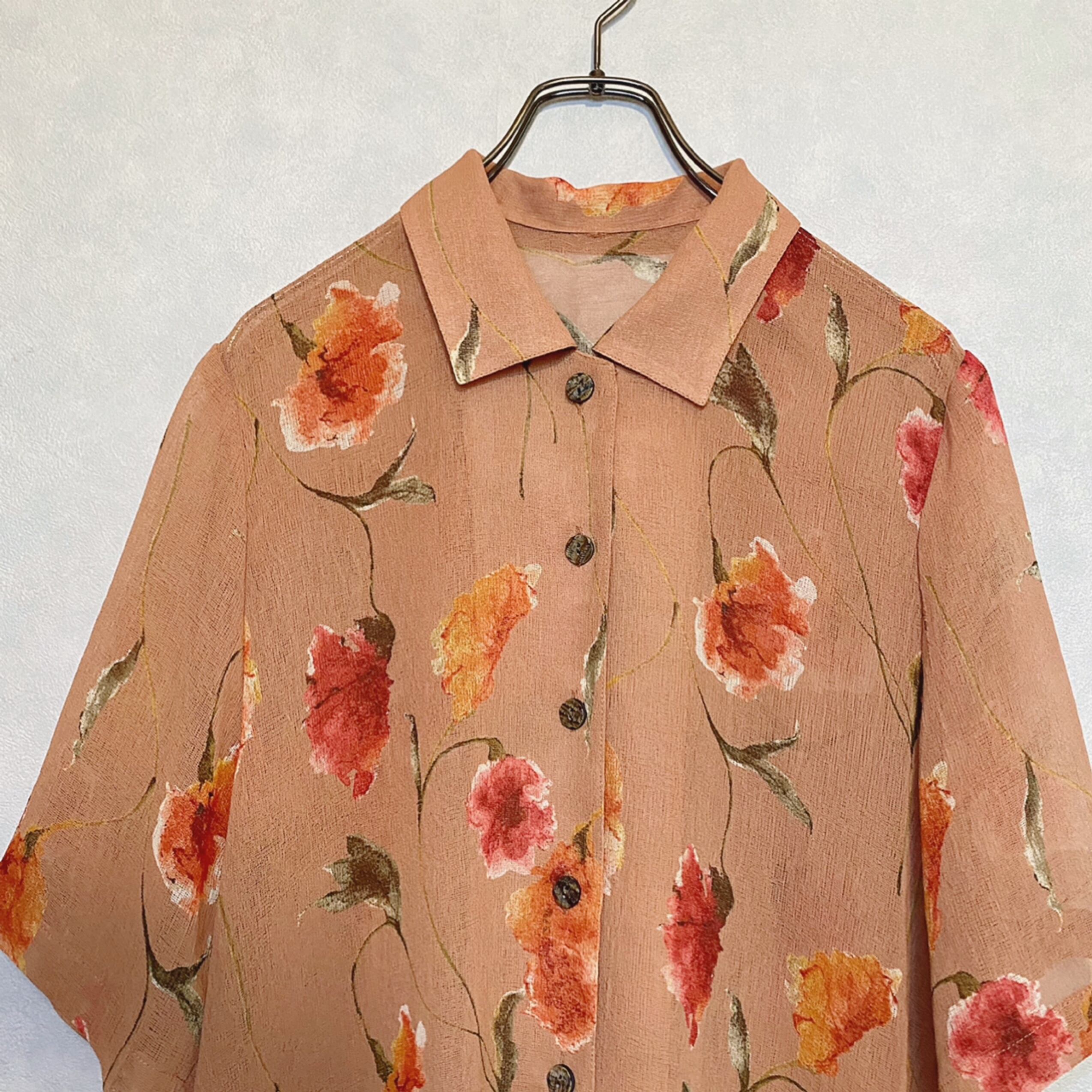 古着屋 レトロ 花柄 シアーシャツ 透け感 くすみオレンジ ブラウス ゆるだぼ