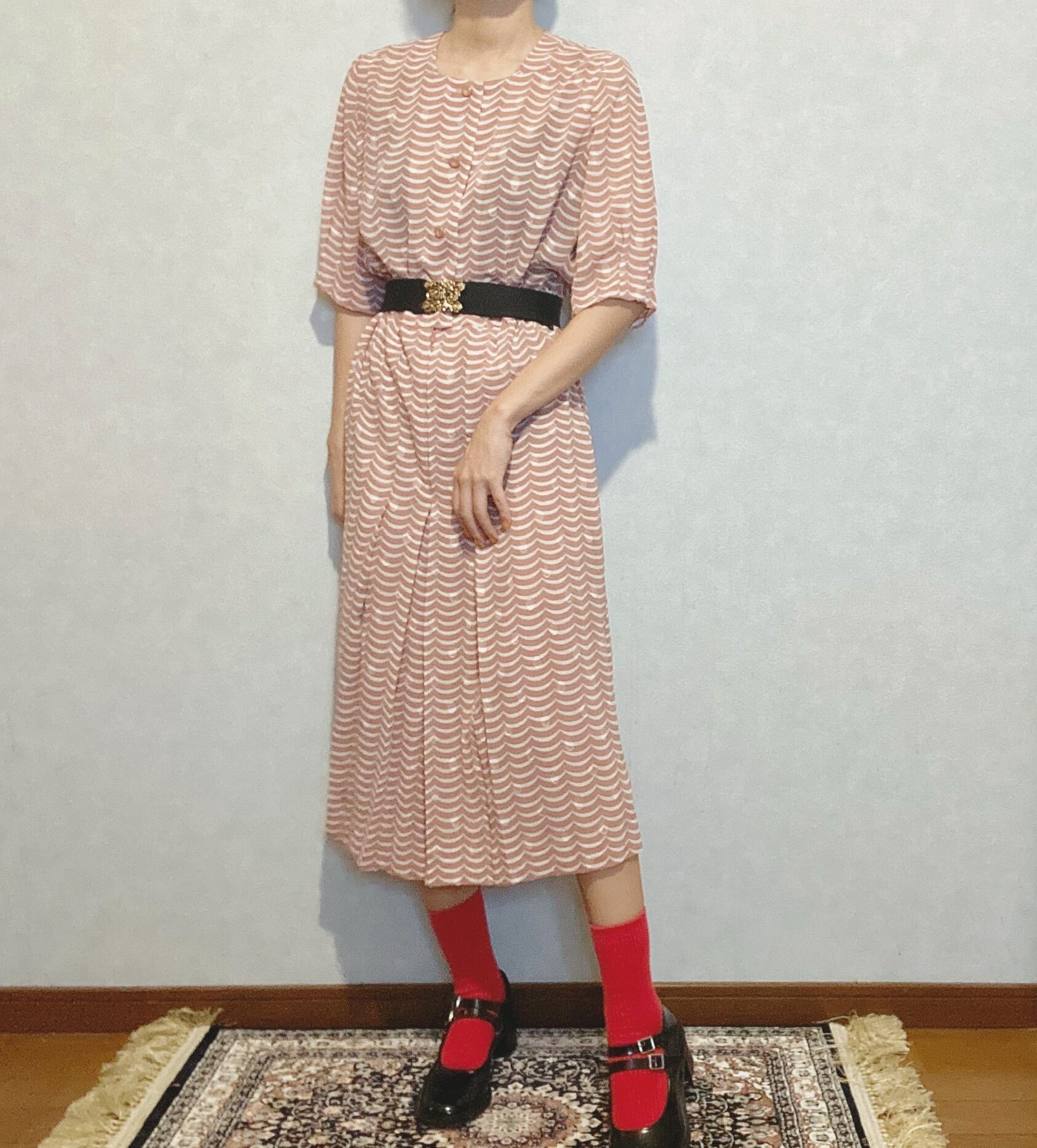 古着屋 昭和レトロ なみなみ柄 総柄 くすみピンク プリーツ ワンピース