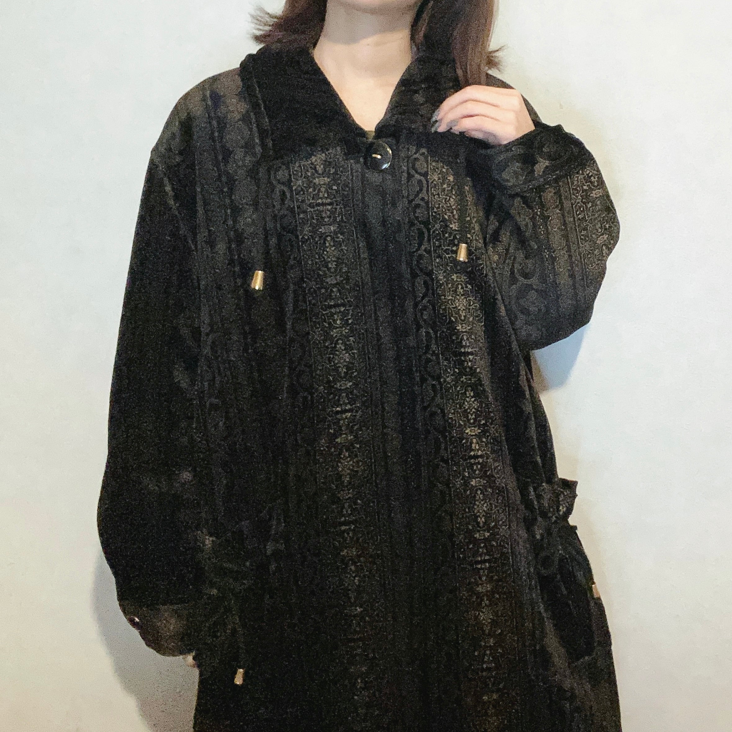 黒地のベロア素材にオリエンタルの総柄がプリントされたロングコートです。